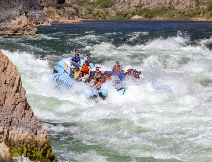 All of our motorized trips are run with two 35-foot-long rafts. Each raft holds about 14 guests and 2 crew for a maximum group size of 32 people. One of our experienced guides will drive each raft from the back (or stern). Although noise from the motor is audible, guests find it doesn’t detract from their experience. During orientation, your river guides will point out the features of the raft including how and where to hold on during rapids.